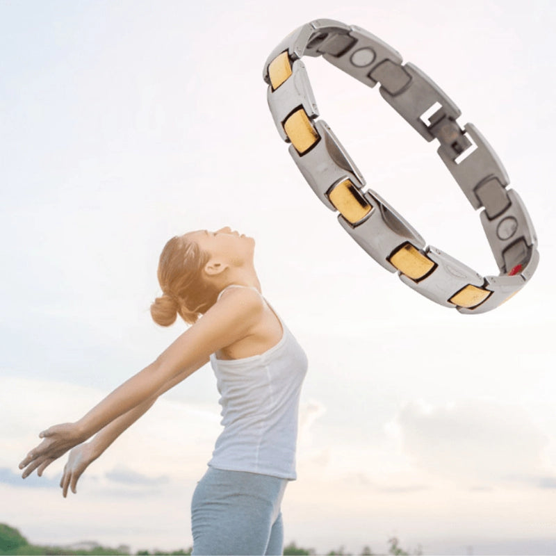 prepárate para sentirte más centrado y lleno de vida. este brazalete fusiona estilo y bienestar, usando la terapia magnética para apoyar tu equilibrio natural y encender tu energía interior. es tu declaración de que priorizas tu salud, con un toque de elegancia.