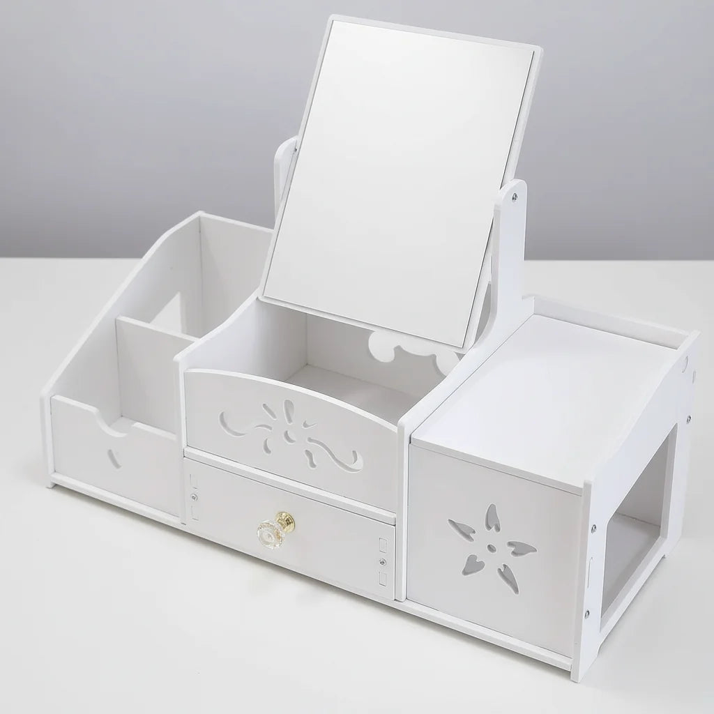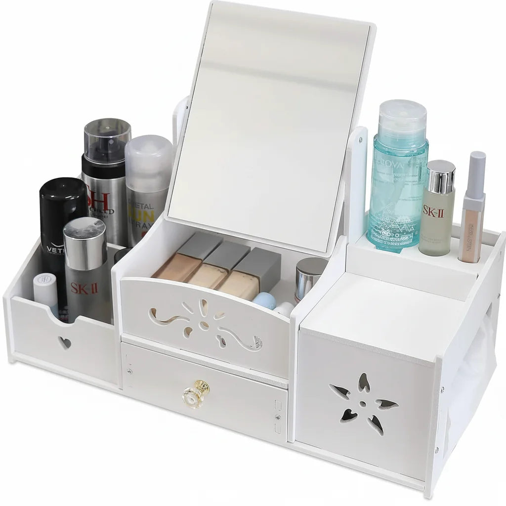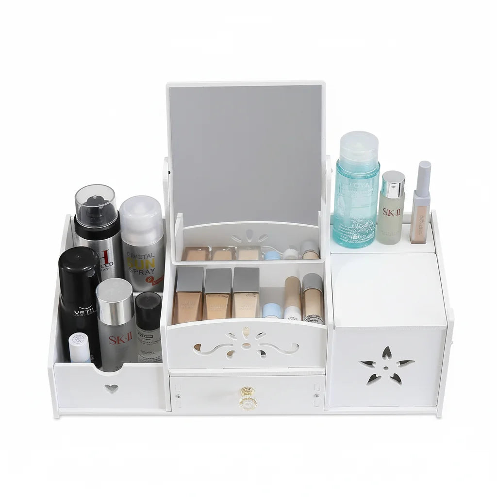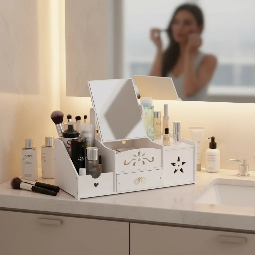 Transforma el caos en tu santuario personal. Con compartimentos pensados y espejo integrado, tus esenciales estarán a mano para una aplicación flawless y sin estrés.