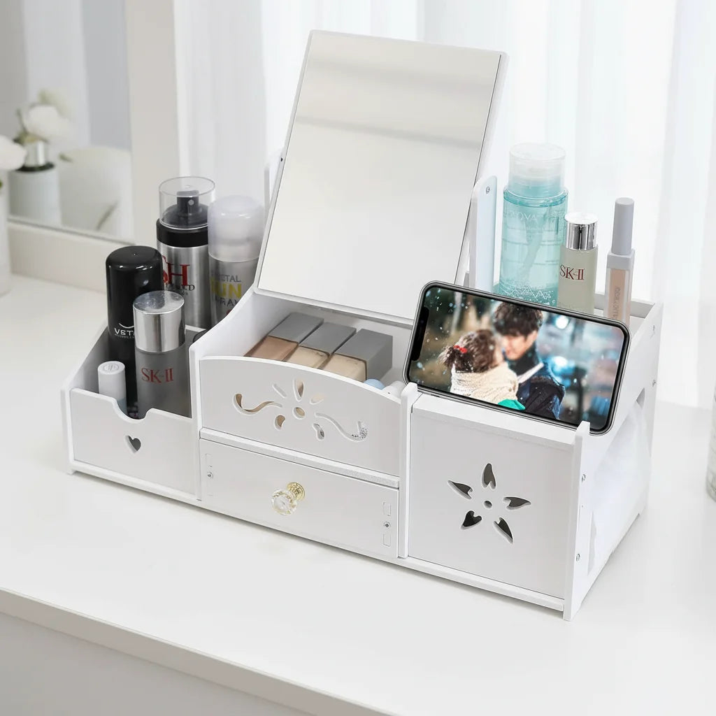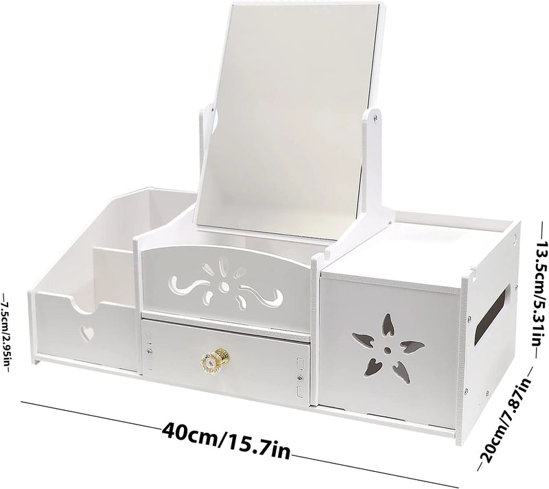 Transforma tu rutina de maquillaje con esta caja organizadora con espejo integrado, diseñada para mantener todos tus cosméticos perfectamente ordenados, protegidos del polvo y siempre a mano, mientras aporta un toque moderno a tu vestidor.
