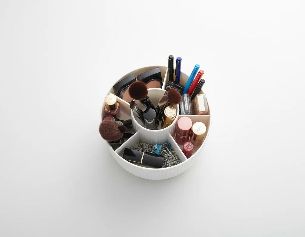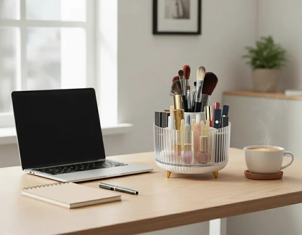 Diseñado para infundir claridad y orden, transforma tu espacio en un santuario personal. Su rotación de 360° y compartimentos inteligentes hacen que encontrar tus esenciales sea un acto de fluidez y belleza, no una búsqueda.