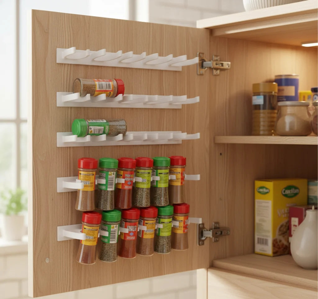 Organiza tu cocina de forma inteligente con el Jarlock x20, un organizador de especias adhesivo, divisible y ajustable que te permite aprovechar espacios desaprovechados como puertas de armarios o azulejos.