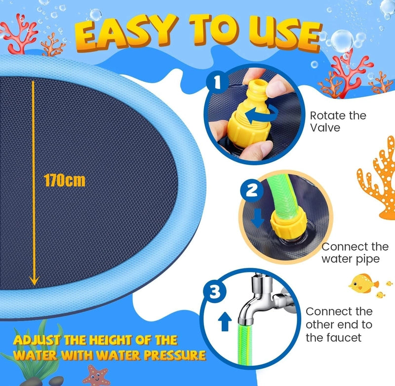 Imagina la cola de tu perro moviéndose de emoción y la risa de tus hijos mientras se refrescan juntos. Esta alfombra transforma el patio en un oasis de alegría y diversión, ¡sin complicaciones! Muy fácil de usar. Tan sólo ponla en una superficie plana del jardín o patio y enchúfala a la manguera. El agua cubrirá en menos de un minuto la superficie de la piscinita y enseguida empezarán a salir chorritos de agua hacia arriba. También vale para niños.